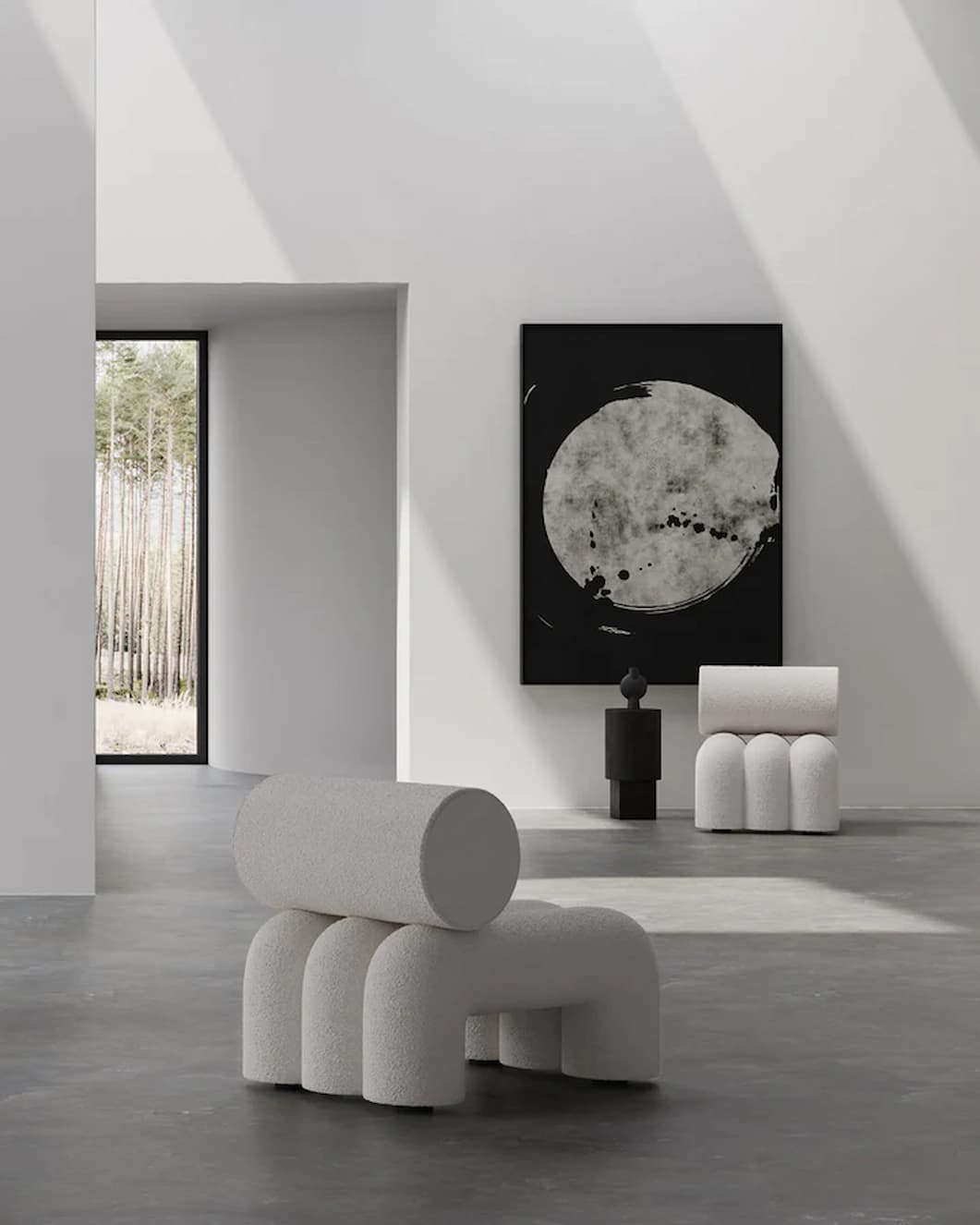 101 Copenhagen inspired by the shapes of traditional Japanese garden tools, Foku is a full upholstery lounge chair made of simple geometric shapes merged into a sculptural furniture design. Foku meaning fork in Japanese, is a reference to the traditional rake tools used in Japanese Zen gardens for centuries. The fork, used to gently create minimalistic lines and waves in the sand, is reinterpreted into the fluted seat of the Foku chair. Several layers of carefully chosen foam types is combined to ensure a soft and highly comfortable seating experience, as well as emphasizing the sculptural and voluminous shapes of the chair. Combine several Foku Chairs to create a sofa lounge seating. Each Foku Chair includes two metal brackets, which can be mounted underneath the legs with a small screw. Foku comes in Off-White Bouclé and a Taupe fabric from Sunproof. The fabric is highly resistant to stains, water, and sunlight, making it very easy to clean as well. Designed by Kristian Sofus Hansen & Tommy Hyldahl.