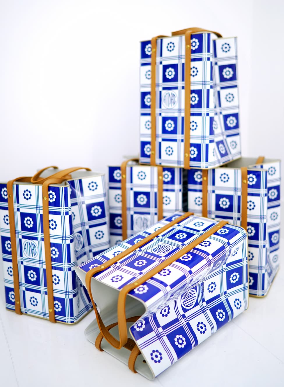 SudioLav the blue and white tin food container (tenekes) is an iconic everyday object. Used to store and transport olive oil and feta cheese, two of the most popular culinary goods of the country, its presence still adorns and services the Greek household. With Atlas Shopper, a tin and leather tote bag, STUDIOLAV turned this cult object into a witty fashion accessory for a daily wander in the city or the interior of a home.