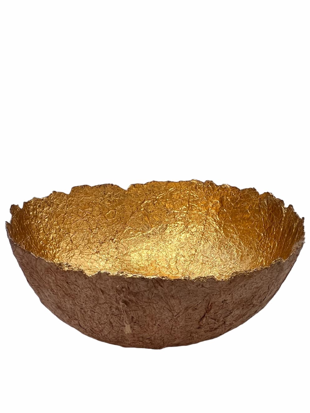 Benu the “wavy” paper pulp bowl is handmade from 100% waste newspaper. The rough texture and the gold inner surface offer an ideal combination for an eye catching and festive decoration.
