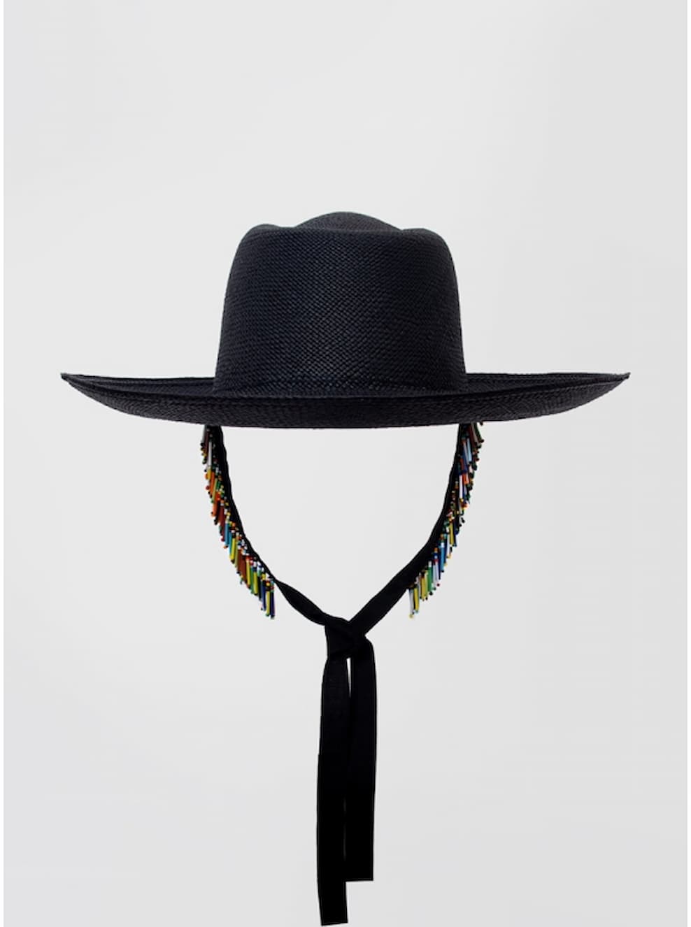 Blanc Raffia Panama hat with cotton bands decorated with beads. Composition: 100% Panama straw. Made in Greece