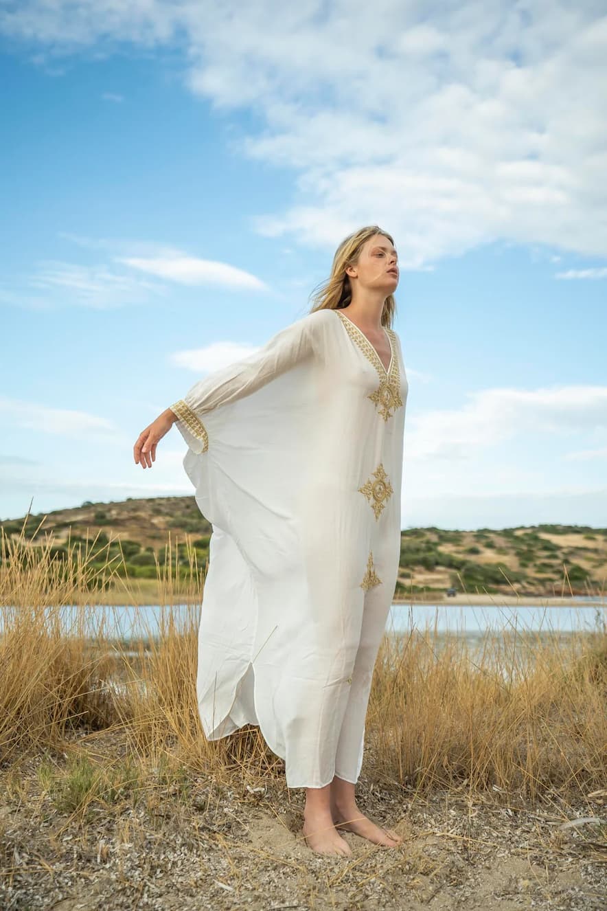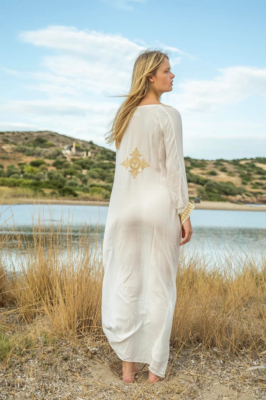 Christian Zen the Kalinka maxi caftan is crafted from 100% tencel, an elegant style with embroidery down the front, on the back and on the sleeve finishings. Perfect fit for all body types. Made in Greece.