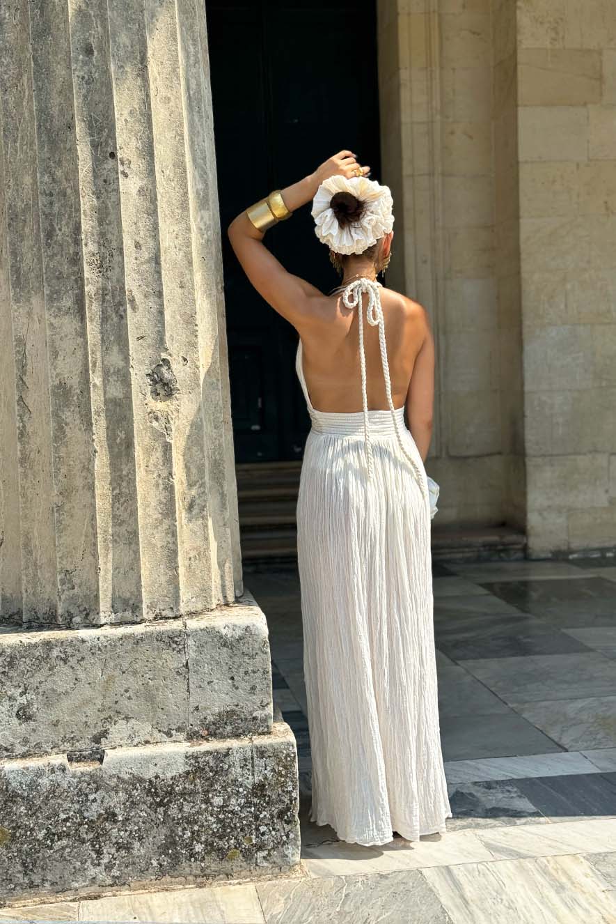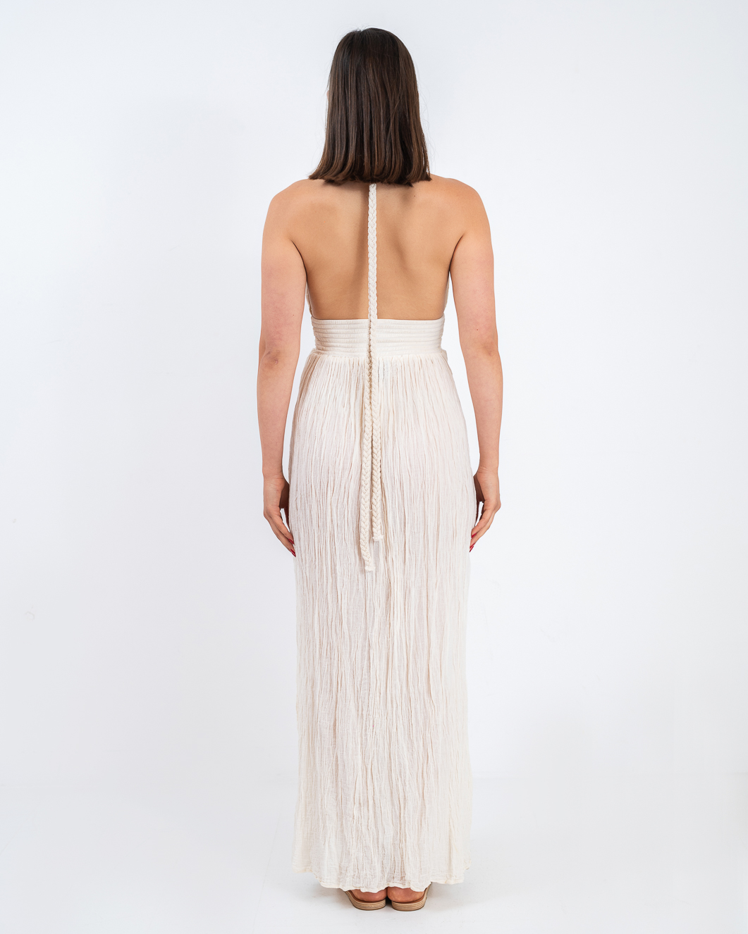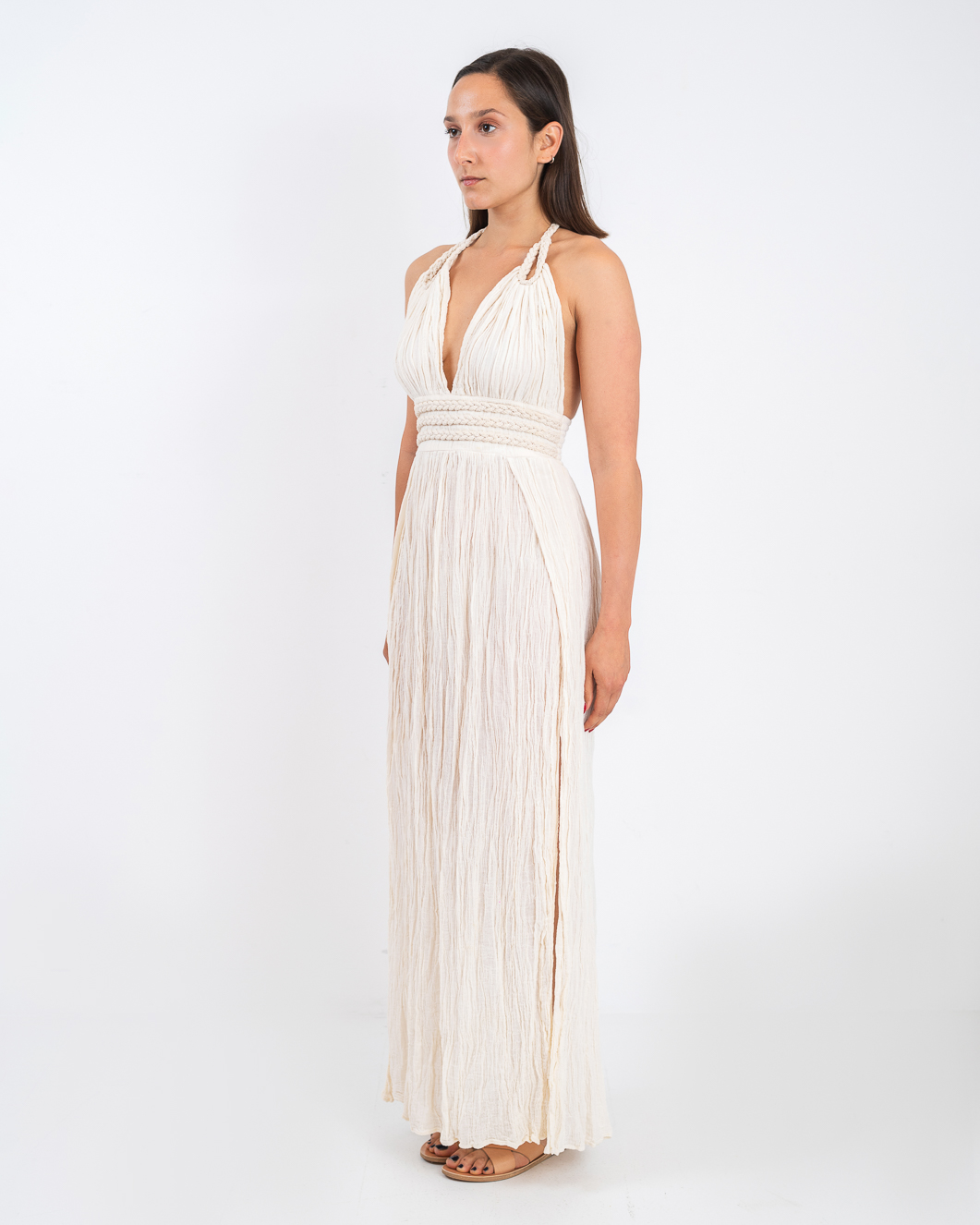 D’Artemide dress with v-neck and strap neck tie, back outside, elastic waist at the back. Made in Greece.