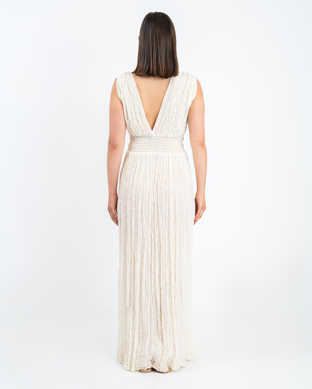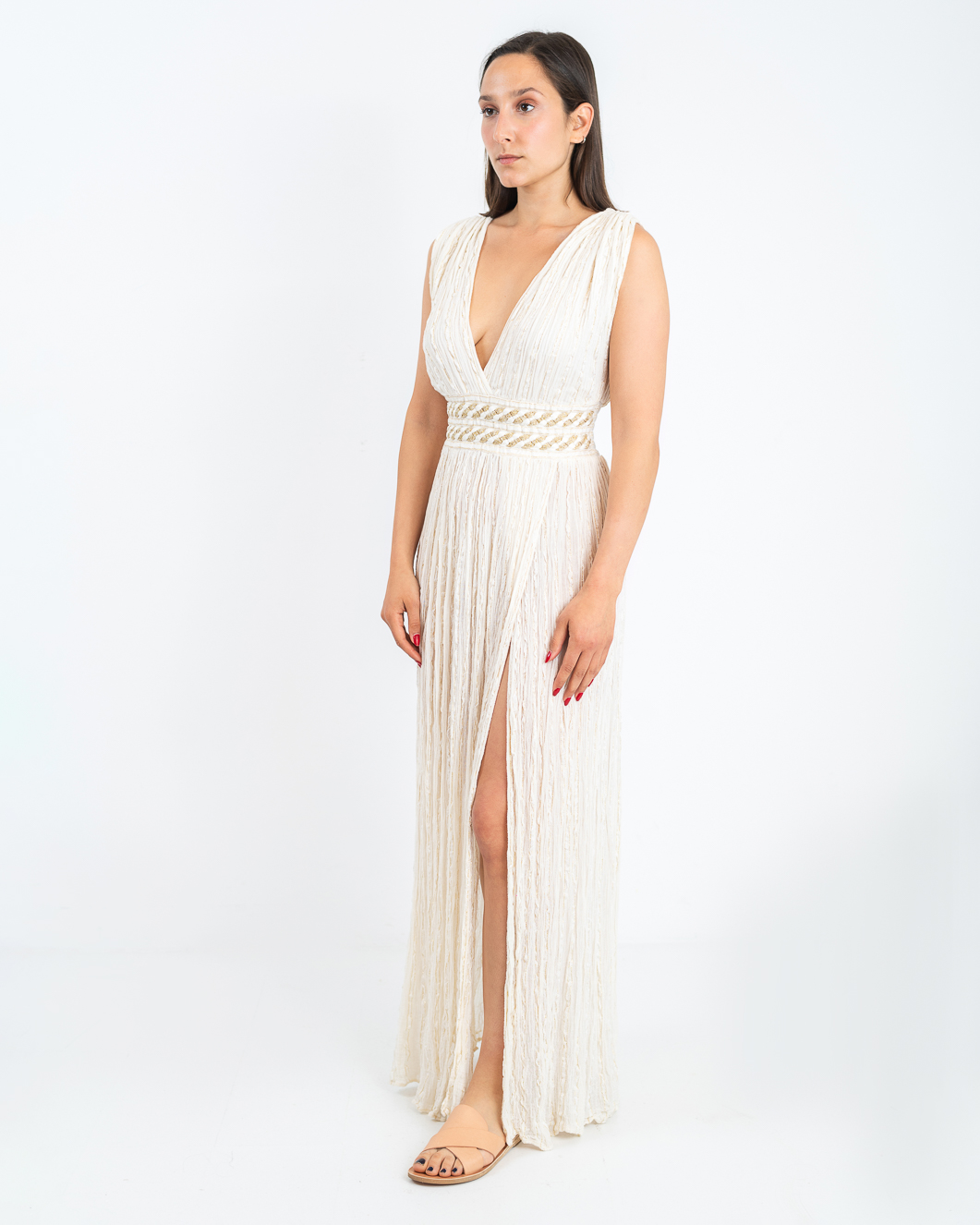 D’Artemide long dress with wide strap V neck, elastic at the back of the waist,tear in front . Made in Greece.