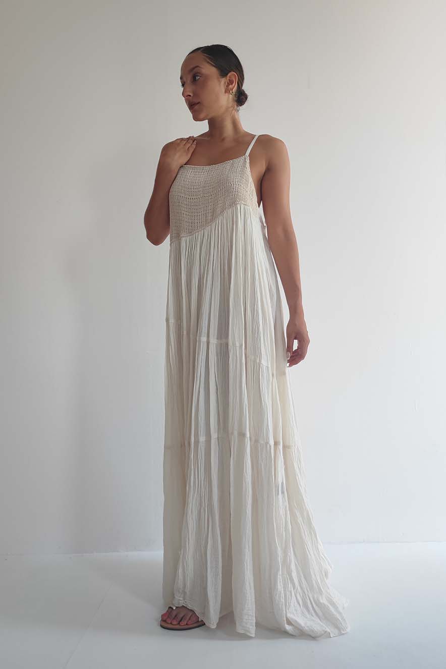 D’Artemide Electra Maxi Dress, with a straight neckline and thin straps, weave with contrasting crochet color.