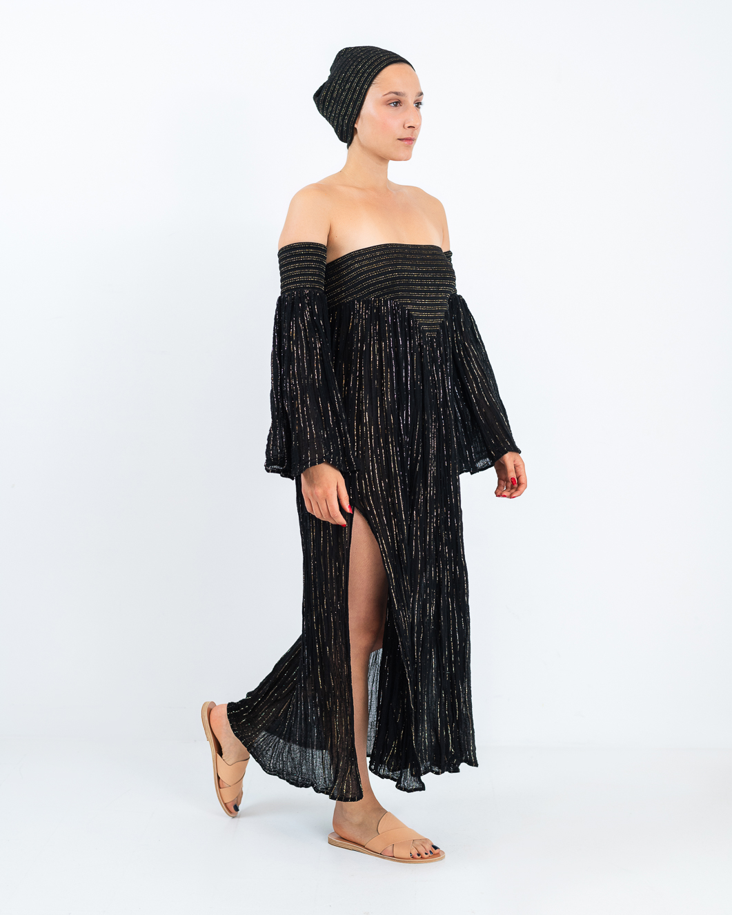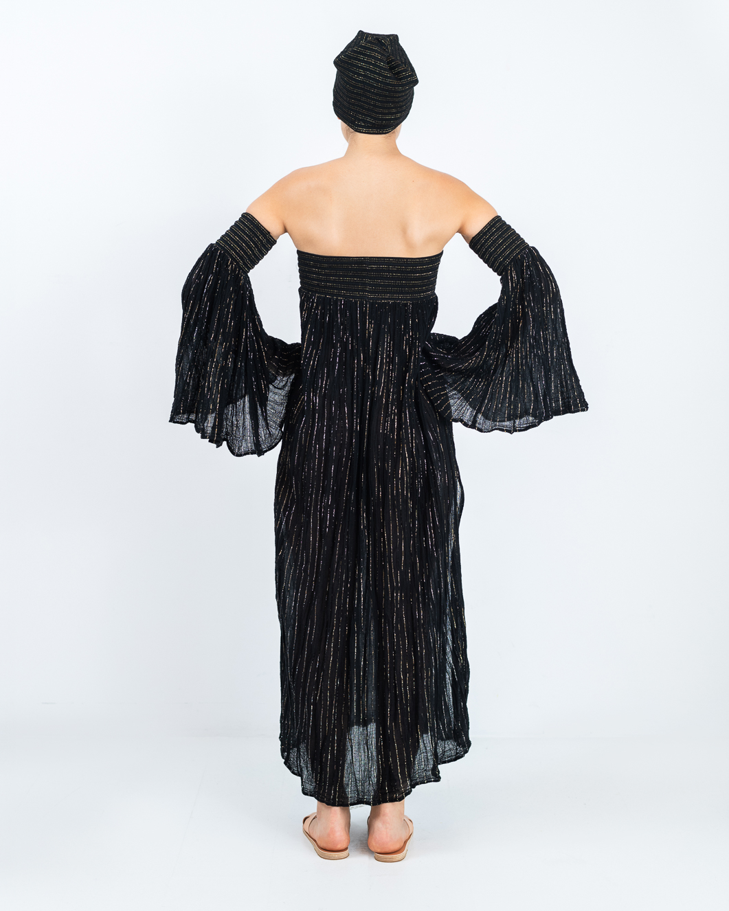 D’Artemide Ophelia Dress strapless, elastic top and A-line skirt with side slit, detachable wide sleeves. Made in Greece.