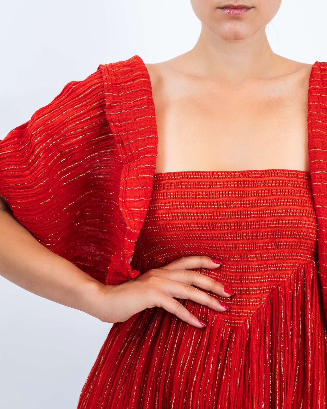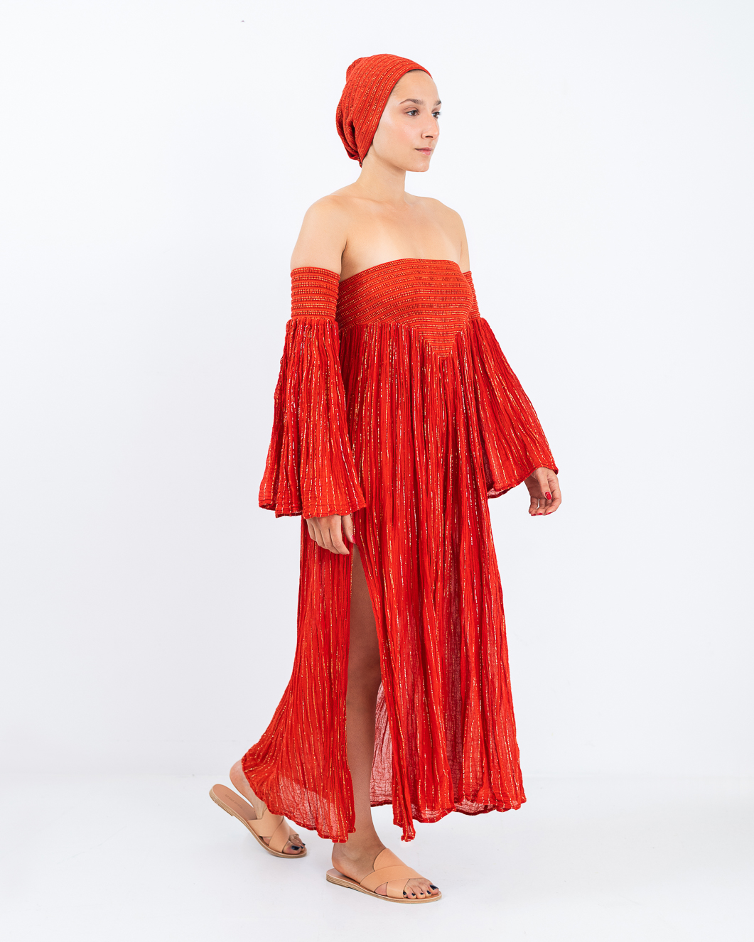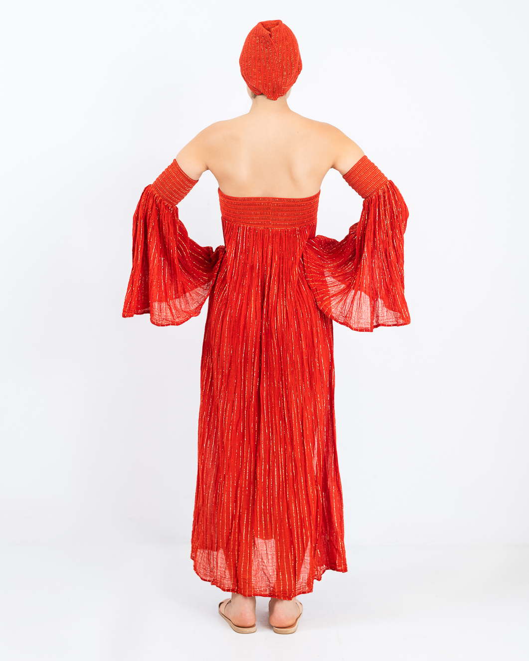 D’Artemide Ophelia Dress strapless, elastic top and A-line skirt with side slit, detachable wide sleeves. Made in Greece.