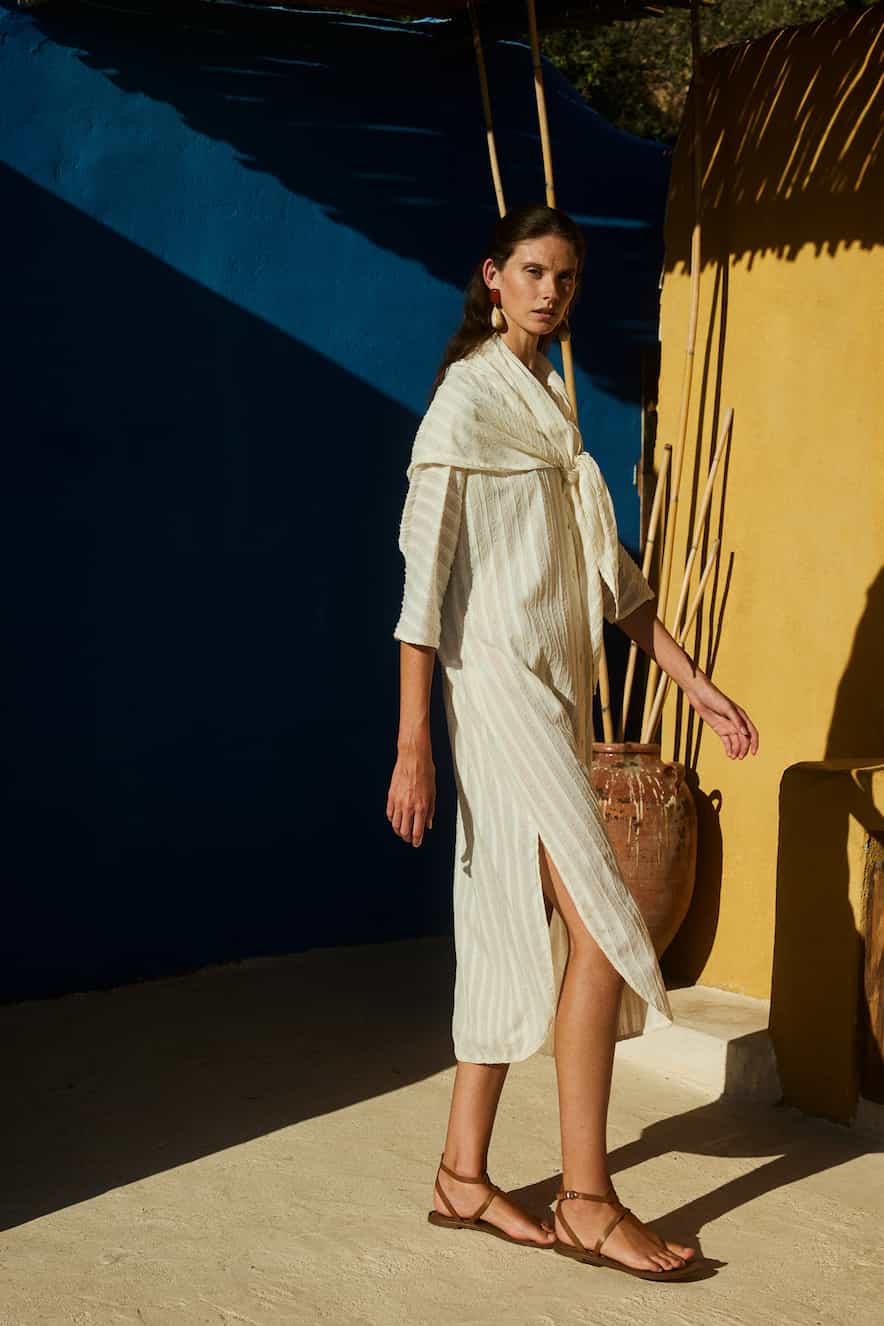 Devotion midi dress with round neck, 3/4 sleeves, button closure, scarf in the same fabric. Composition: 100%COTTON. Made in Greece.
