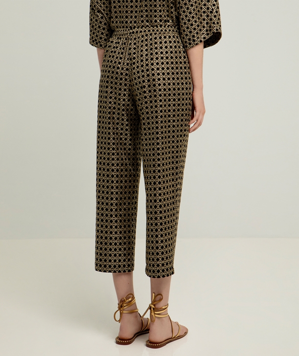 Greek Archaic Kori short high-waisted trousers, fitted with an elasticated waist, side pockets and decorated with impressive embroidery in a geometric pattern. Composition: 100% cotton. Made in Greece.