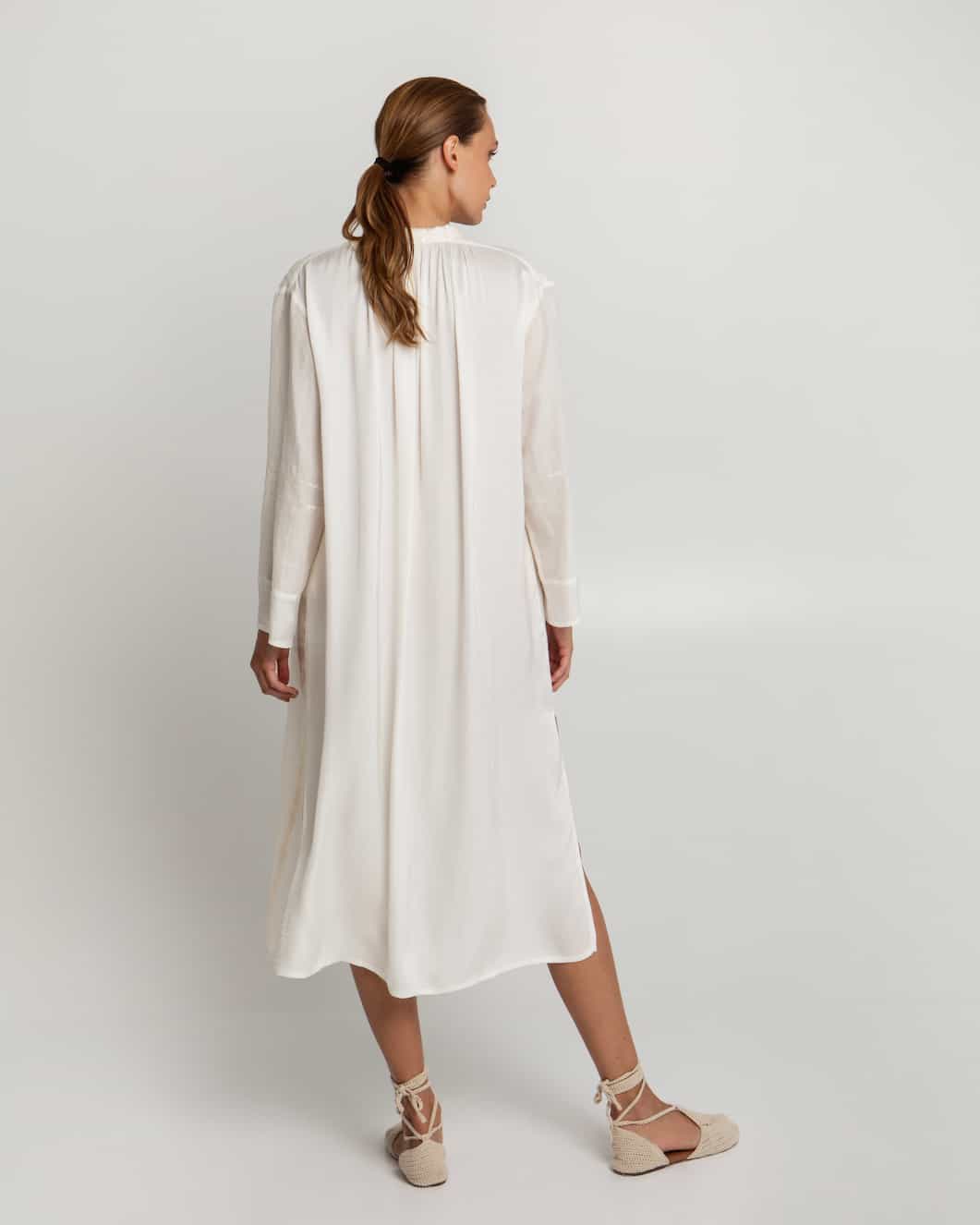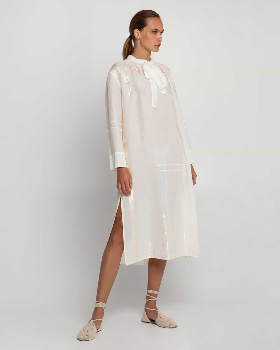 Greek Archaic Kori the Roots Midi Shirt dress  crafted in a gorgeous natural-toned fabric with champagne chevron embroidery, is a chic midi-length design. Featuring long sleeves, a versatile V-neckline with an optional neck tie, and side slits for ease of movement, this shirt dress exudes understated elegance. Pleating across the shoulders at the back adds a graceful drape to its silhouette.