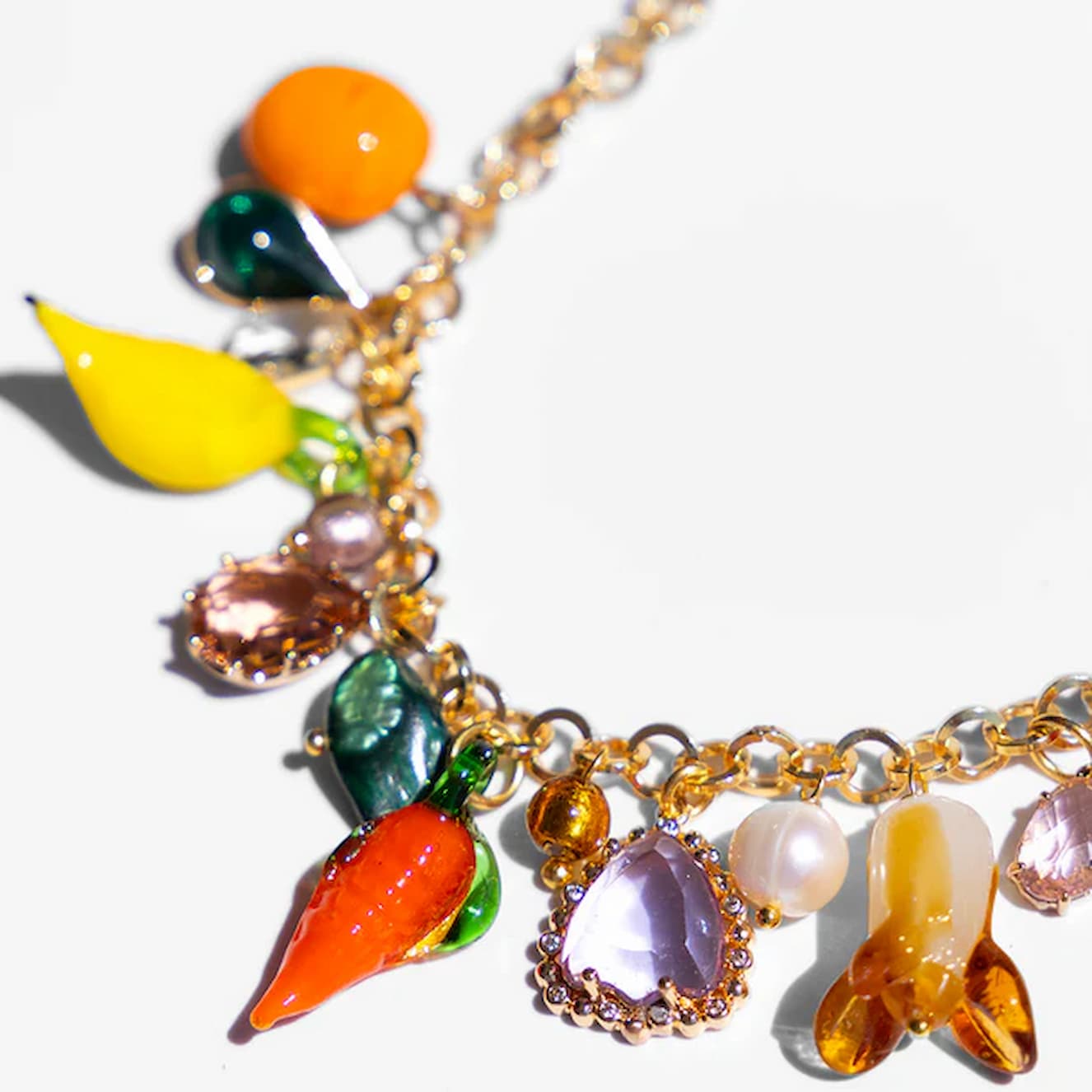 Materials: Glass beads, crystals, pearls, vintage beads in shape of fruits