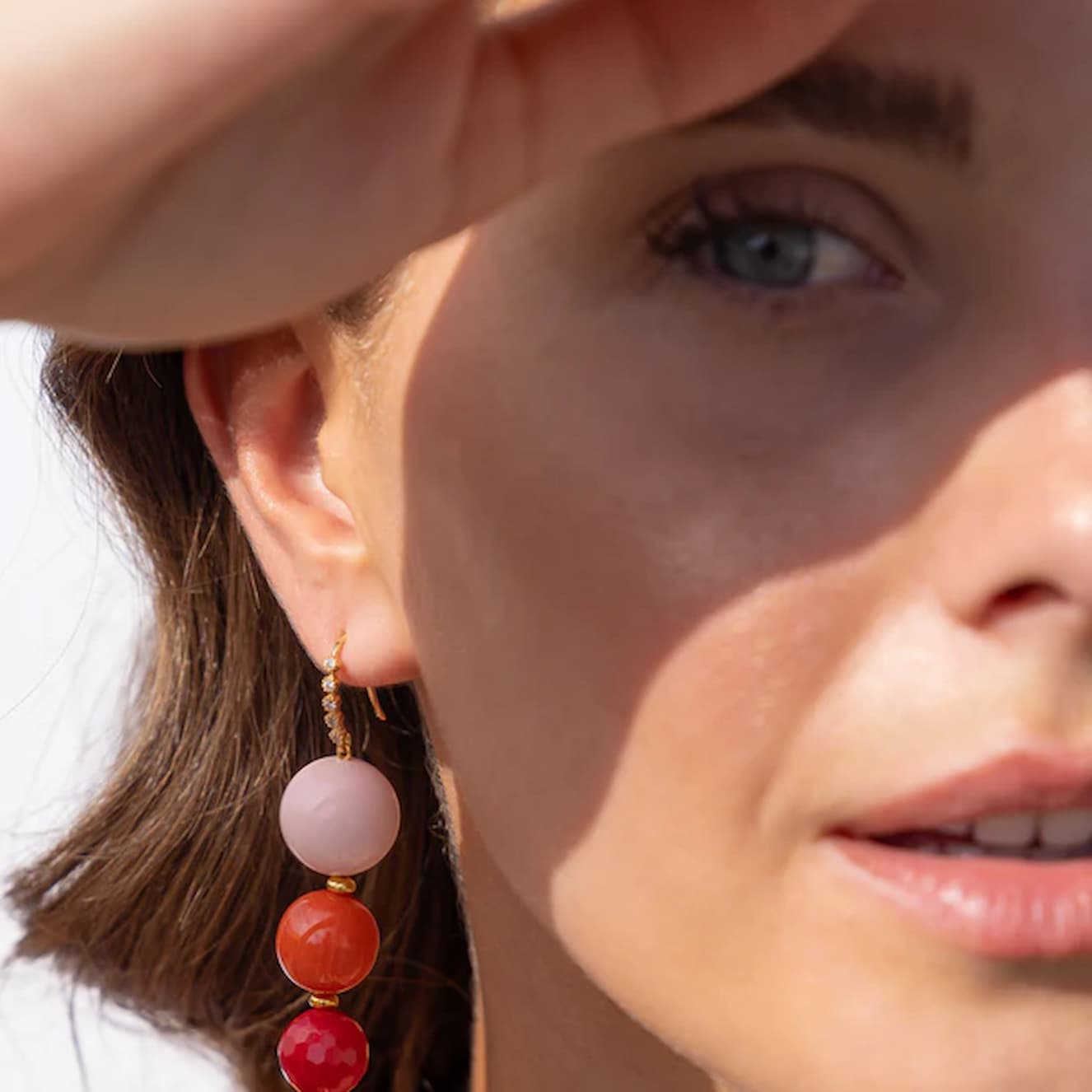 Katerina Psoma gracefully striking, these dangle earrings – in coral tones-showcase three stones that elegantly diminish in size, culminating in a dazzling crystal sparkle. Bold yet refined, they’re the perfect statement piece to elevate any fashion-forward look with effortless glamour.