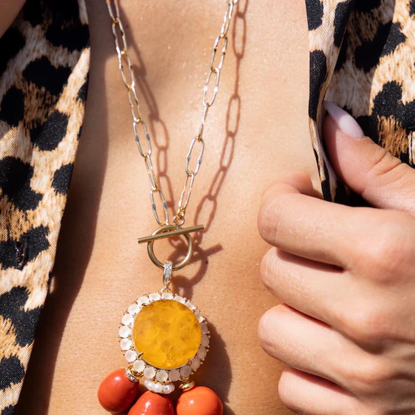 Katerina Psoma This necklace captures an up-to-date fashion feel thanks to its “neo-vintage” style. Exuding an air of cosmopolitan bohemian charm, this exquisite piece features coral drops delicately set on a lustrous yellow stone pendant. The vibrant coral complements the serene yellow stone, creating a harmonious blend. It is suspended from a fine gold-plated chain, making it the ideal addition on a casual wear.