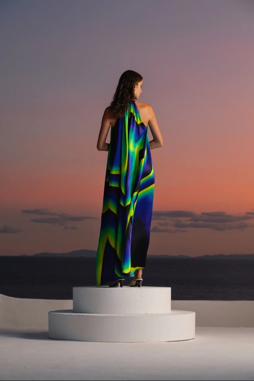 Kose Julia silk satin maxi dress in a loose line featuring a halter neckline and embellished with an impressive print. Composition: 100% SILK SATIN.Made in Greece