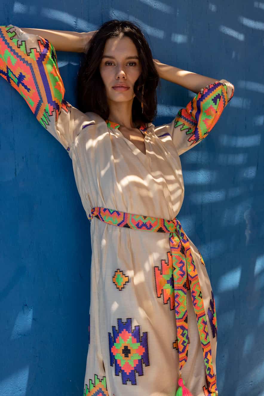 Nema airy midi dress with colorful, traditional embroidery that exudes a boho aesthetic, features wide sleeves a belt that emphasizes the waist a discreet V-neckline for elegance and style. Combotition: 64%PES34%VISC.%SILK. Made in Greece.