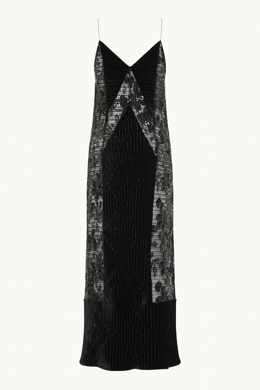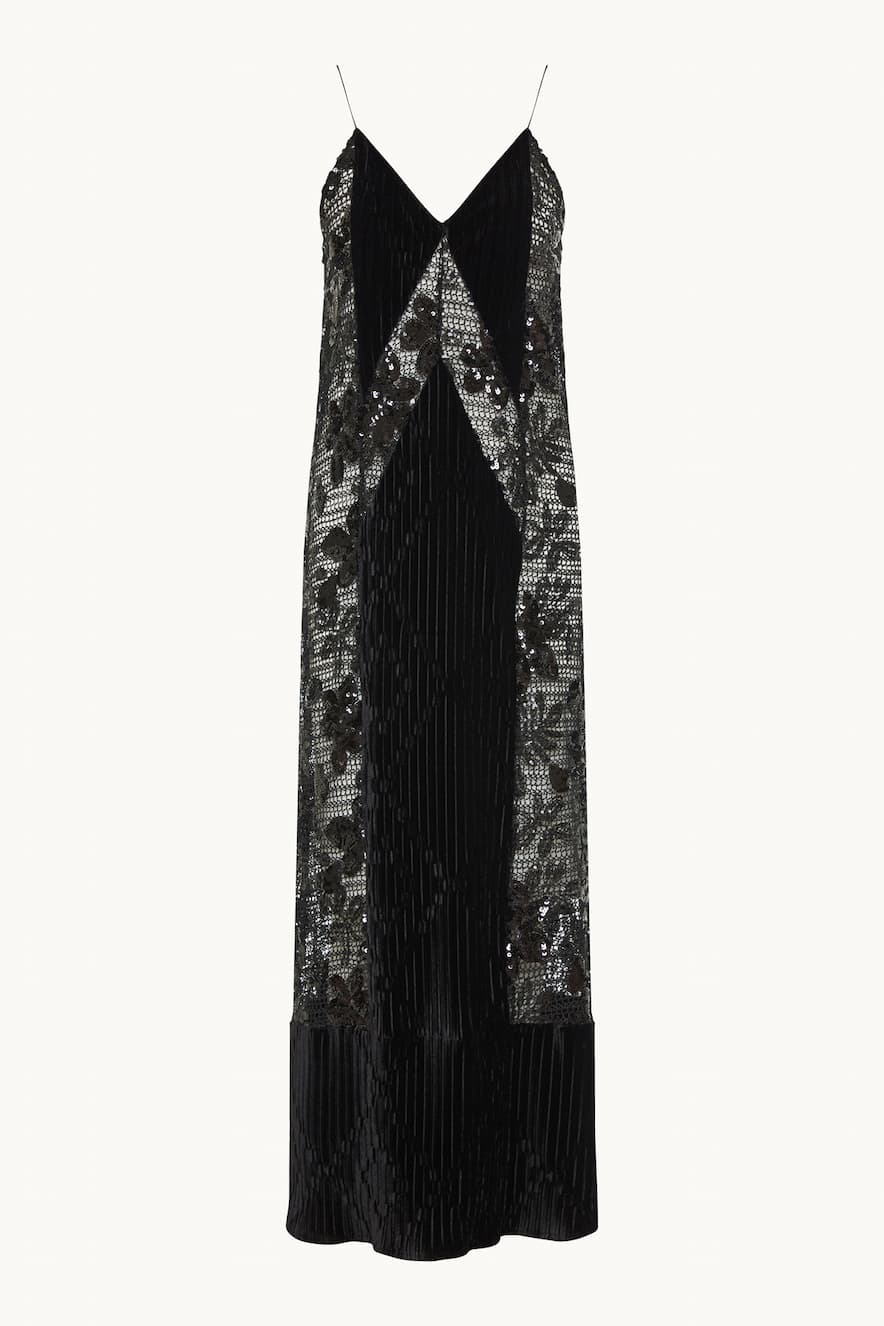 Nidodileda long dress with V-neckline, thin straps, textured velvet fabric and lace details embellished with sequins in a floral pattern. Composition: 45%RAY 50%PL 5%SP. Made in Greece.