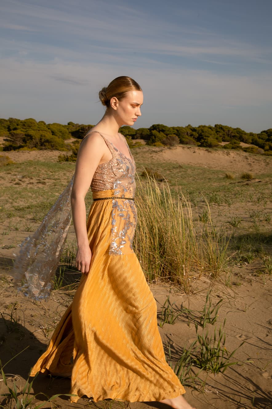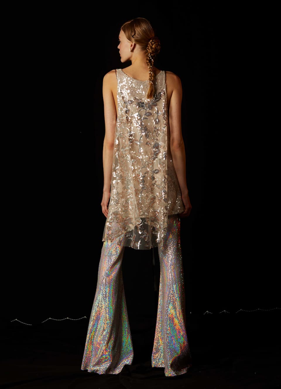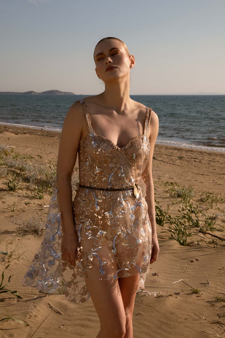 Nidodileda top, transparent sequin embroidered, sleeveless, round neck and open at the sides. (Buttons on the shoulders to fit the Sargasso dress). Multiple dress styling options. Composition: 100% PL. Made in Greece.