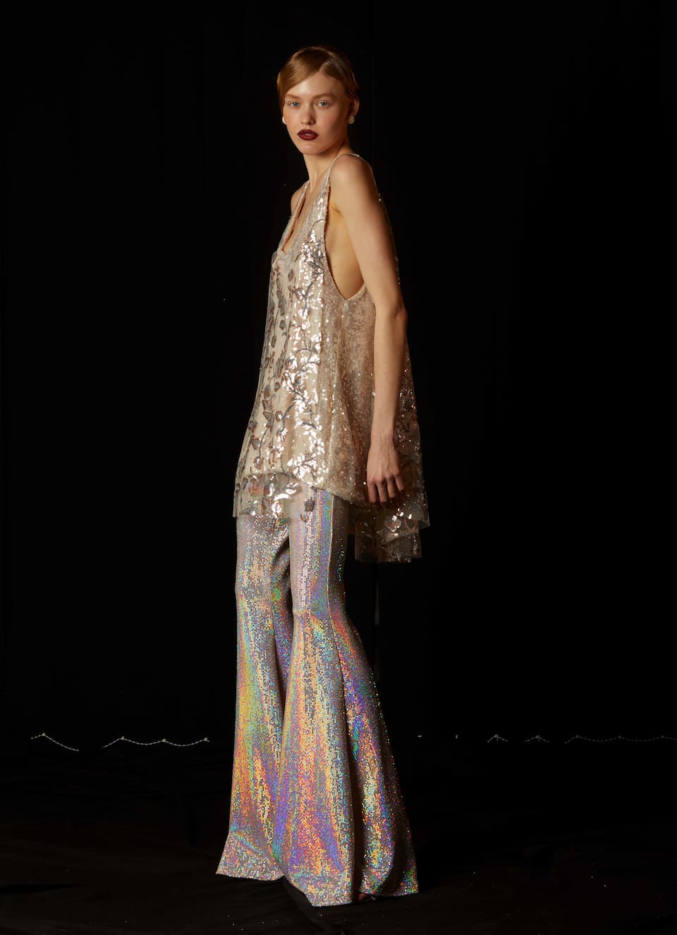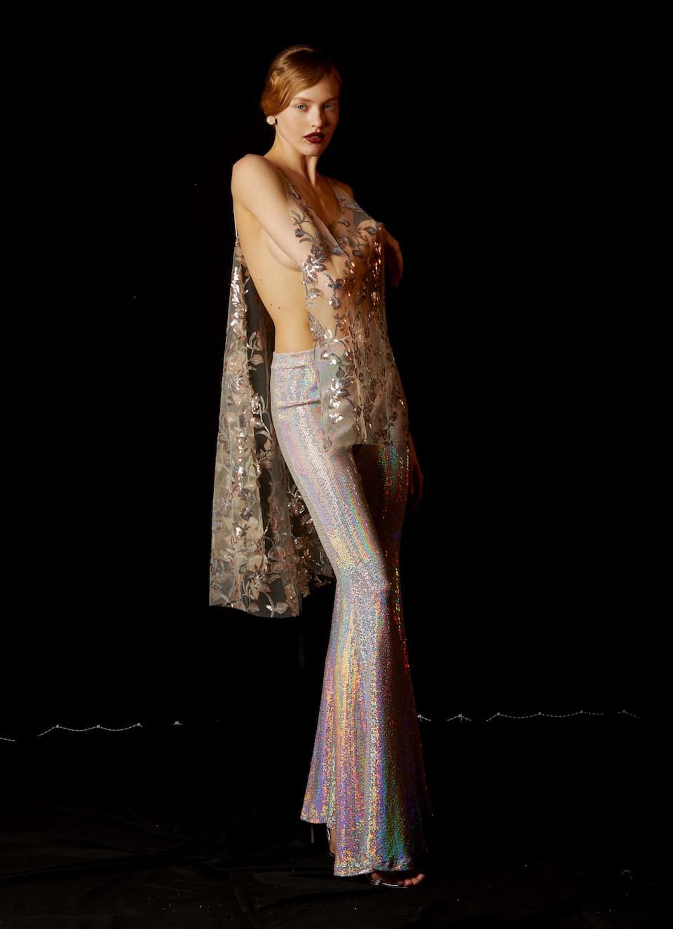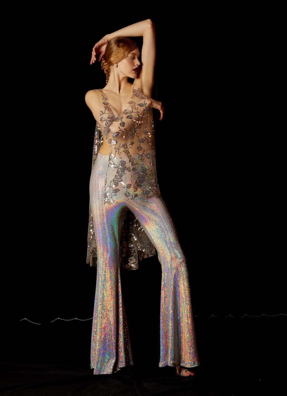 Nidodileda top, transparent sequin embroidered, sleeveless, round neck and open at the sides. (Buttons on the shoulders to fit the Sargasso dress). Multiple dress styling options. Composition: 100% PL. Made in Greece.