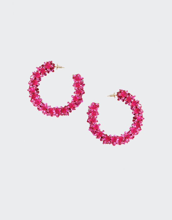 Olivia Dar earings delicate fuchsia large Flower Hoops are made of beads and flower sequins. Made in Europe.
