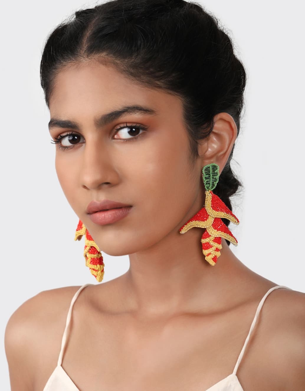 Olivia Dar the Heliconia earrings, inspired by the vibrant flower found in the forests of Kerala, India. Hand-embroidered in 3D, with colors true to its original beauty.