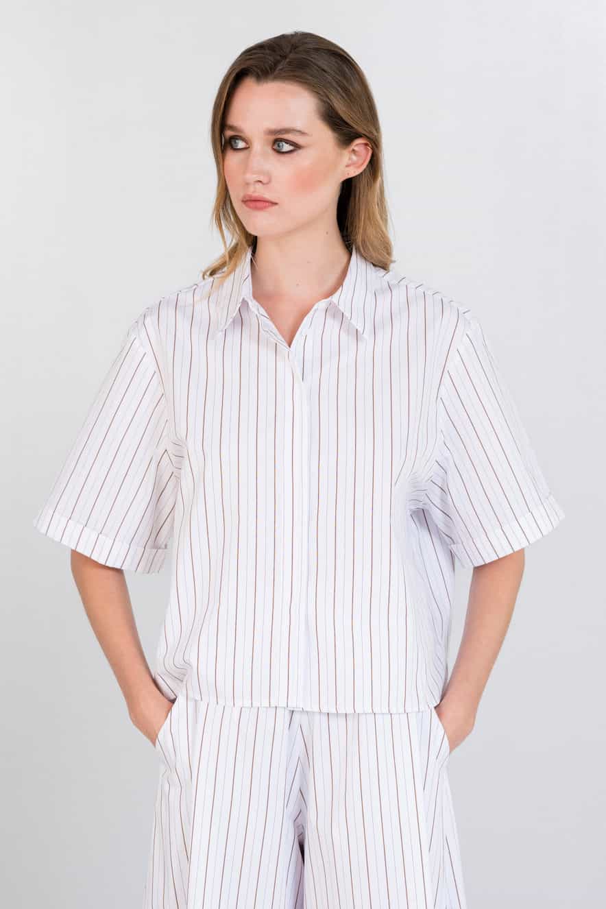 Philosophy Cropped Poplin Stripes Shirt, classic collar and short sleeves for a modern look, thin stripes in a timeless style, Cropped line for a stylish and comfortable fit.