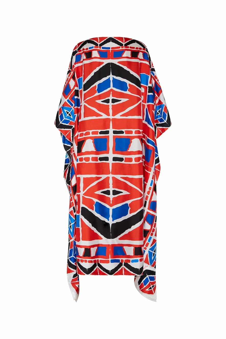 RIANNA + NINA the Kilimi Kaftan Chorio exudes elegance and sophistication, meticulously handcrafted using two luxurious RIANNA + NINA silk scarves in the latest seasonal color palettes. The ankle-length garment is adorned with a tall and broad boat neckline and generously cut sleeves. Style it with exquisite vintage jewelry or adorn yourself with it as the ultimate beach companion.Made in Europe.
