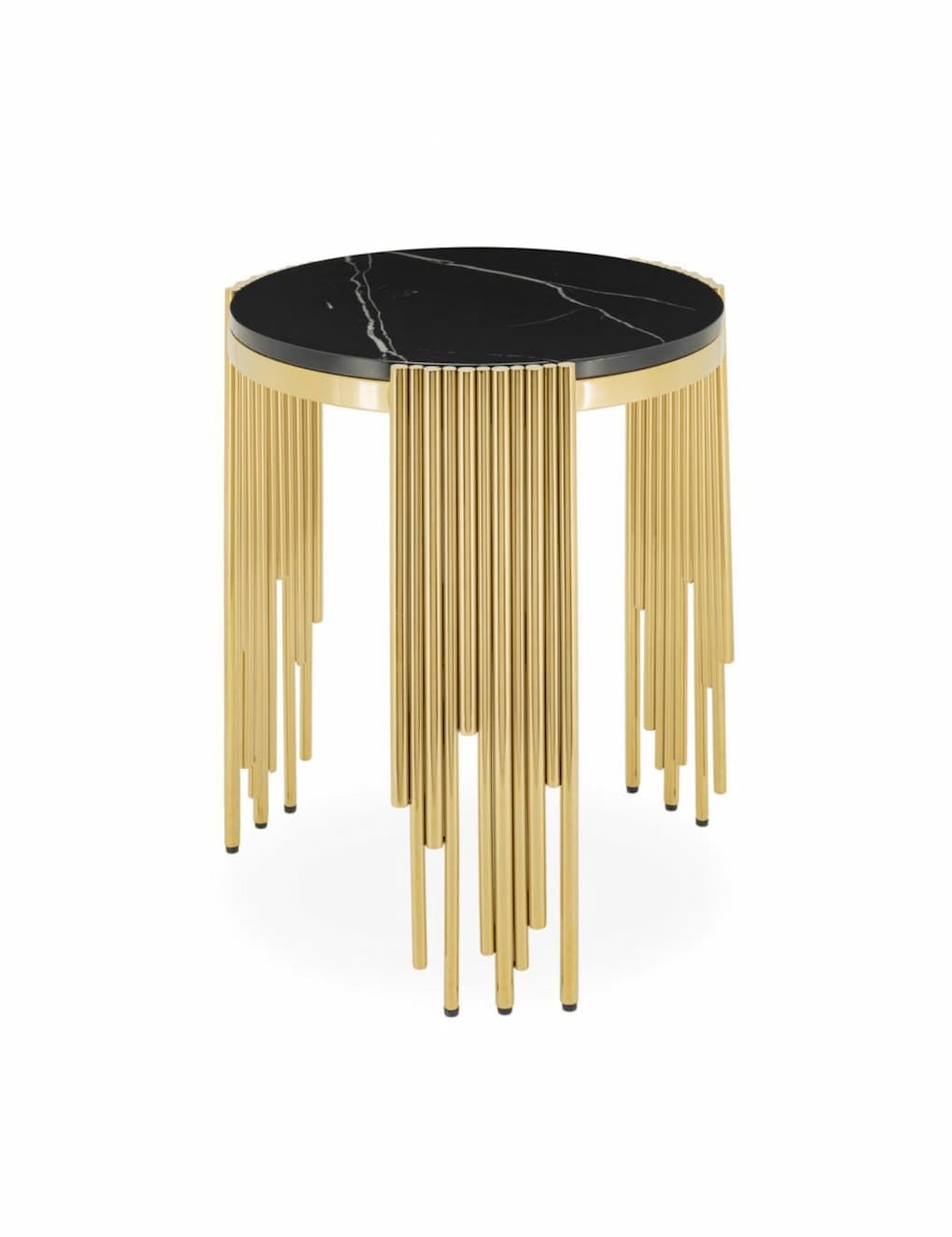 Chromed metal side table with faux-marble top.