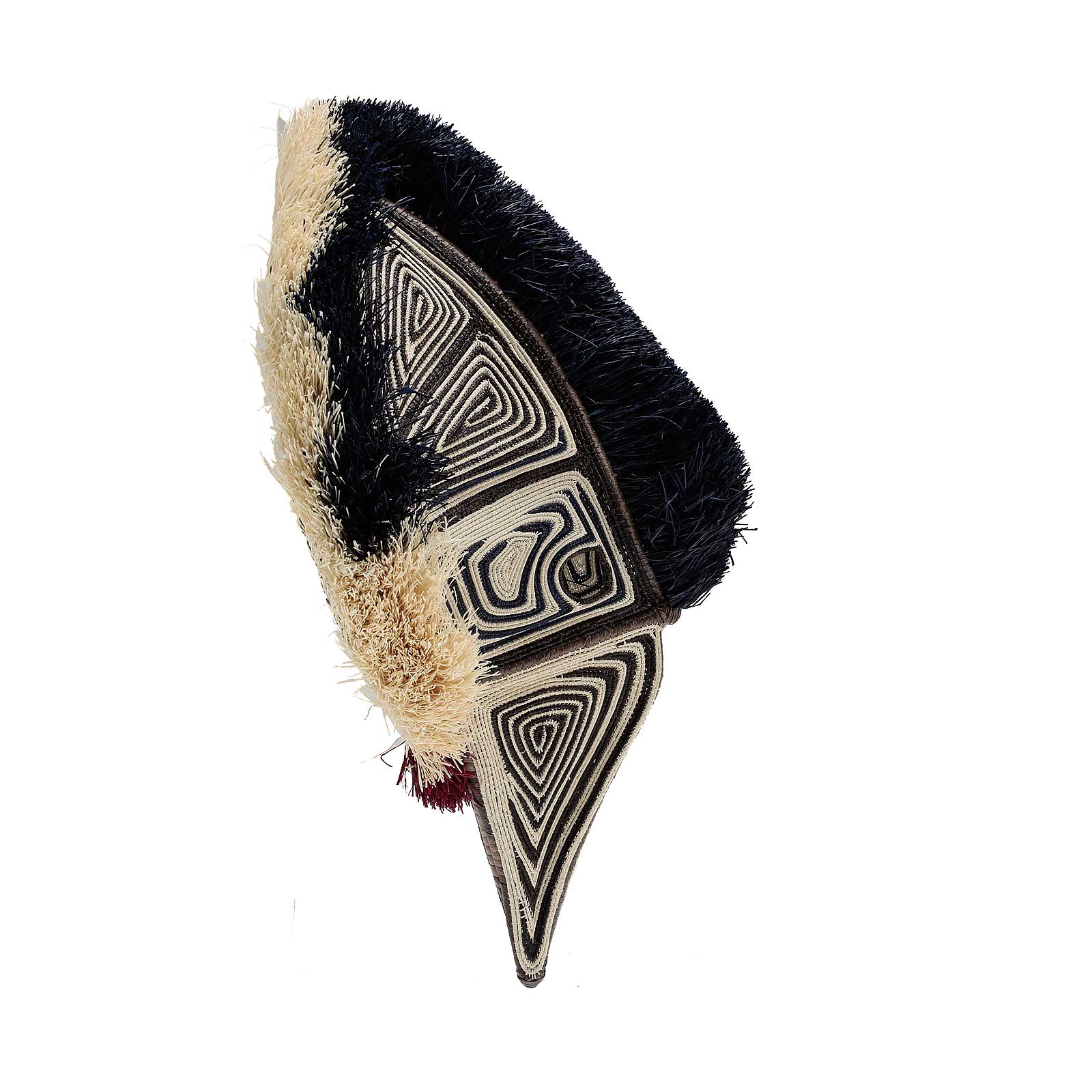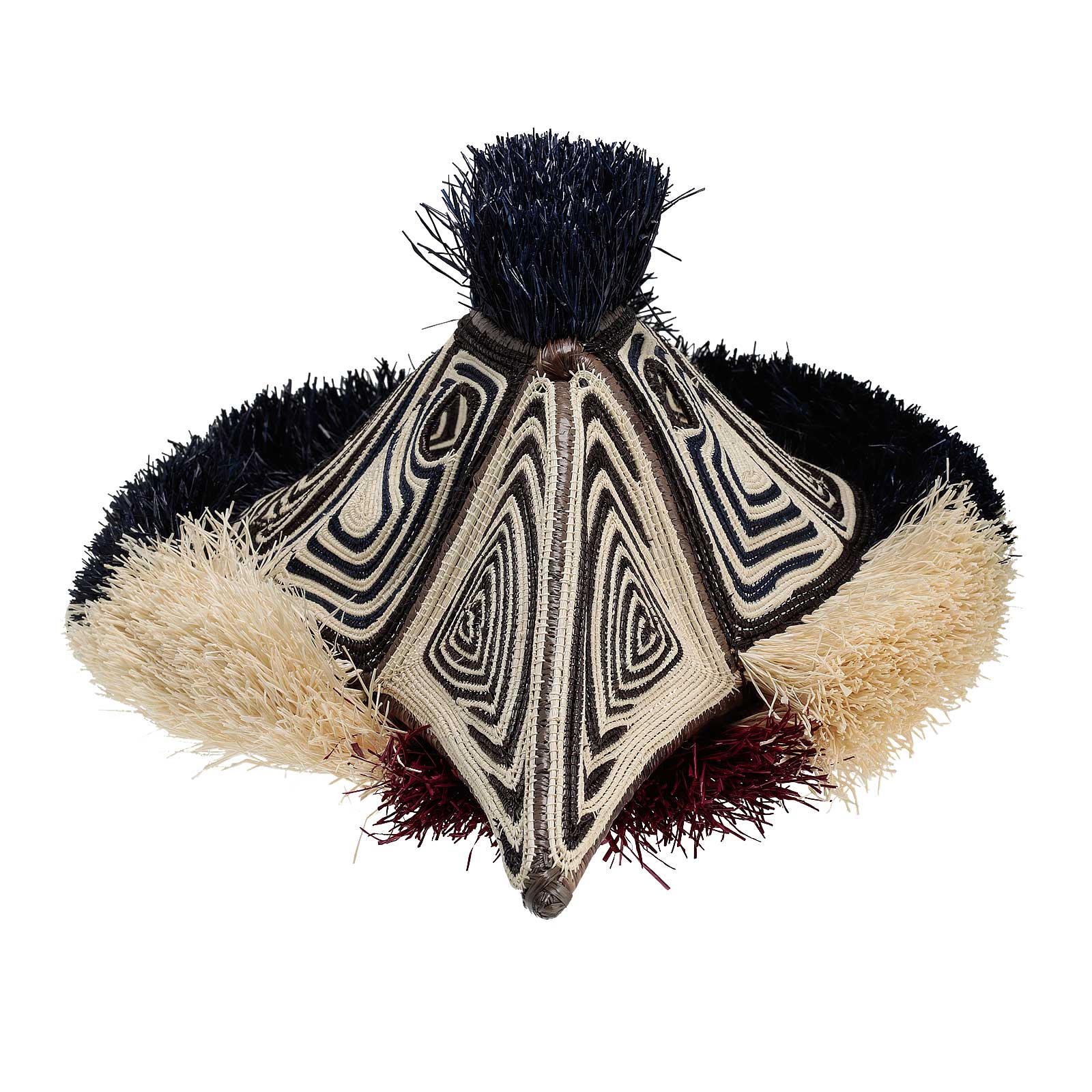 This unique piece is handmade with the changa palm whichis split whitened in the sun and then dyed with natural plant dyes.