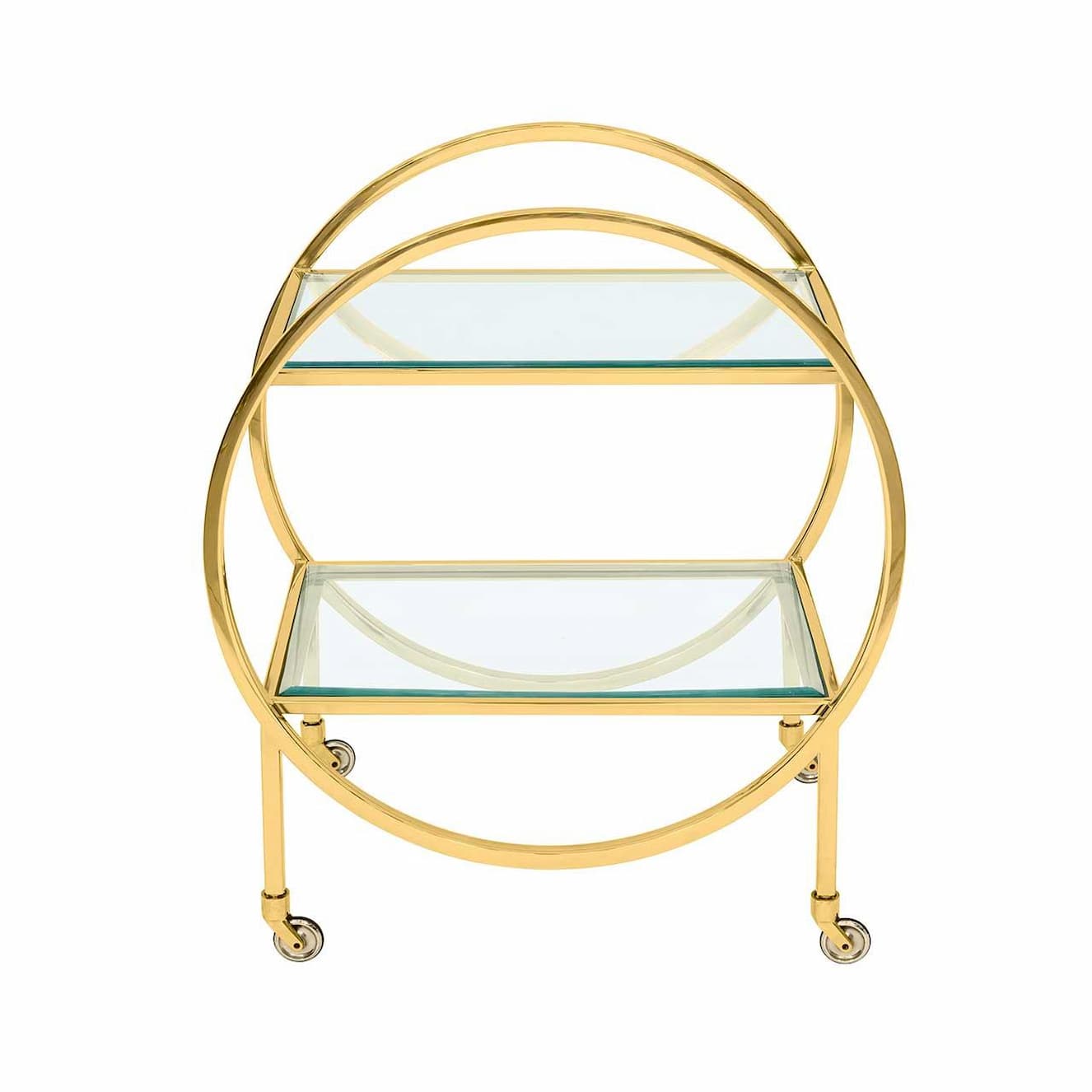 Made with glass tops and refined chromed metal structure with caster wheels.